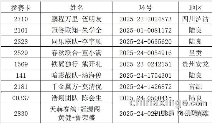 陆良民友2025秋棚450公里决赛迟归鸽名单