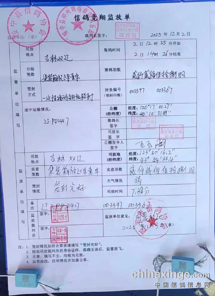 加站赛于12月2日集鸽、3日开笼,将进行加盖暗章、随机打印,并由裁判组亲临现场监督此次集鸽、装笼、开笼、归巢全过程,同时我们将委托媒体对此次训放进行全程网络视频直播,并开启归巢短信通知服务。