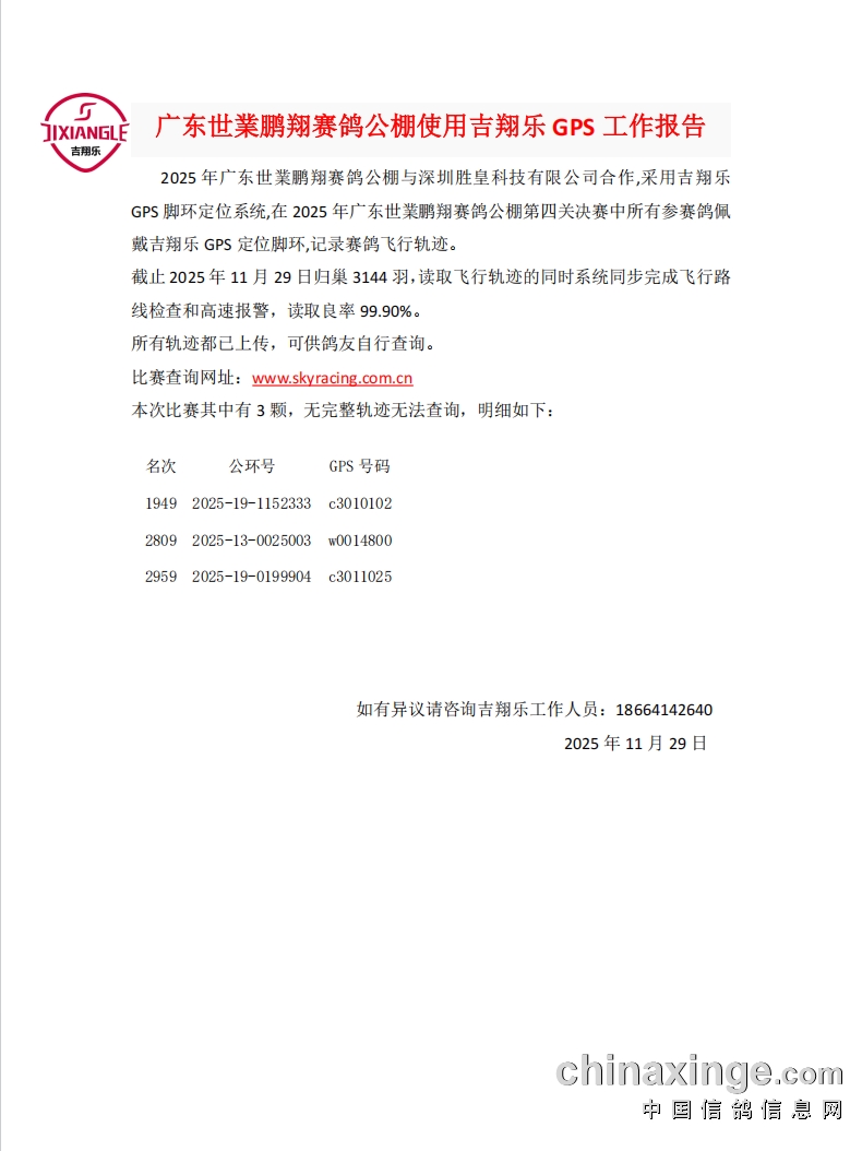 广东世業鹏翔赛鸽公棚使用吉翔乐 GPS 工作报告