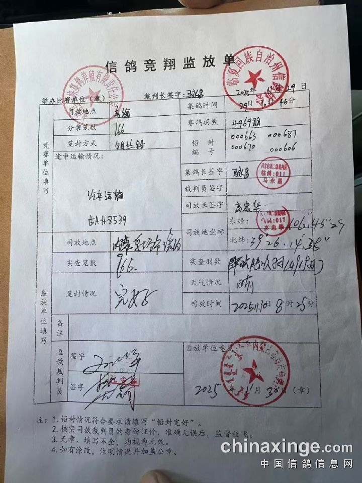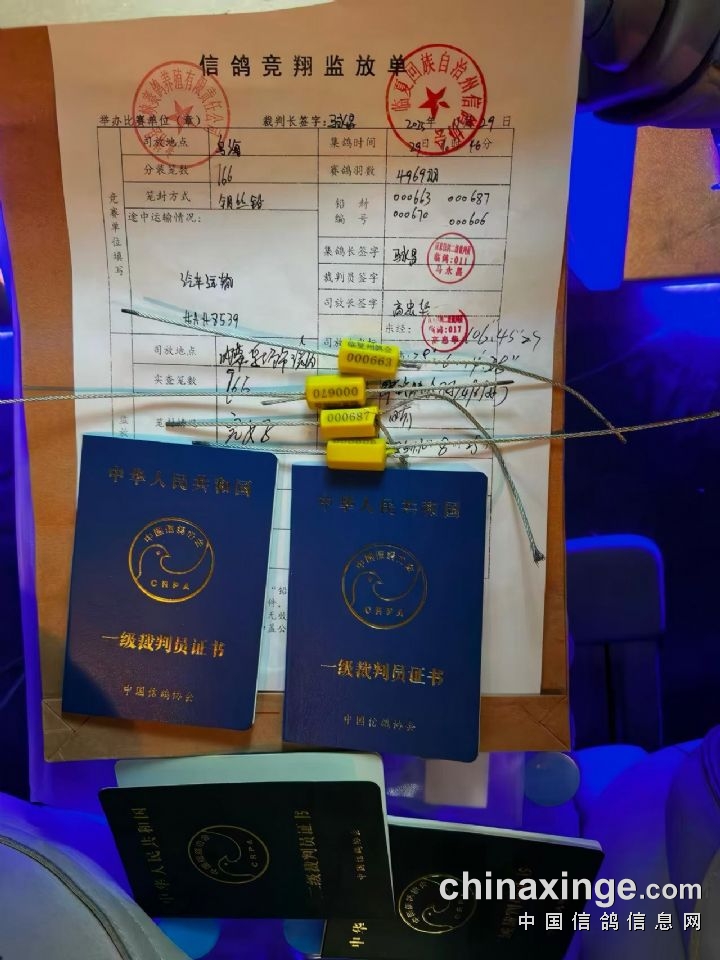 甘肃锦园三峡赛鸽公棚500公里决赛临夏州信鸽协会监放证明单