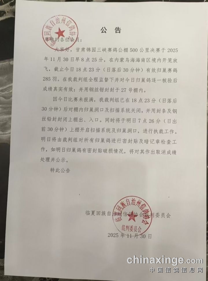 临夏州信鸽协会裁判委员会公告