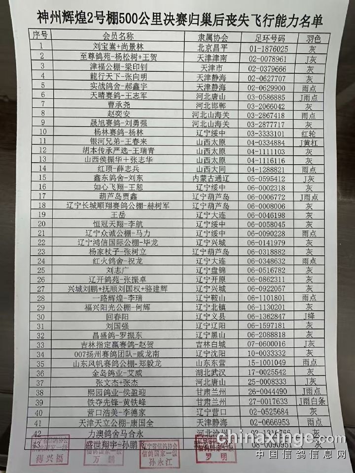 神州辉煌2号棚500公里决赛归巢后丧失飞行能力名单
