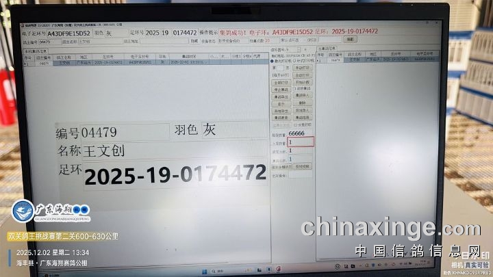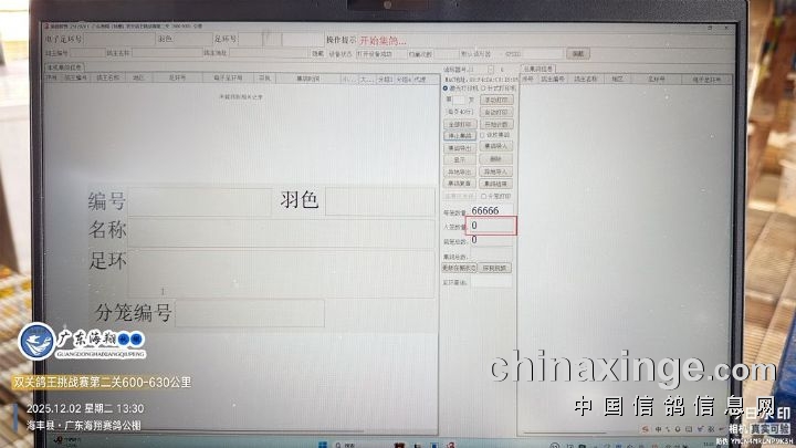 2025年广东海翔(秋棚)第九届双关鸽王挑战赛第二关600-630公里,由广东省鸽协委派裁判长及汕尾市裁判组进行逐羽扫描、盖章、监放等工作;共集鸽5319羽。