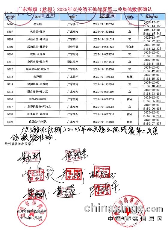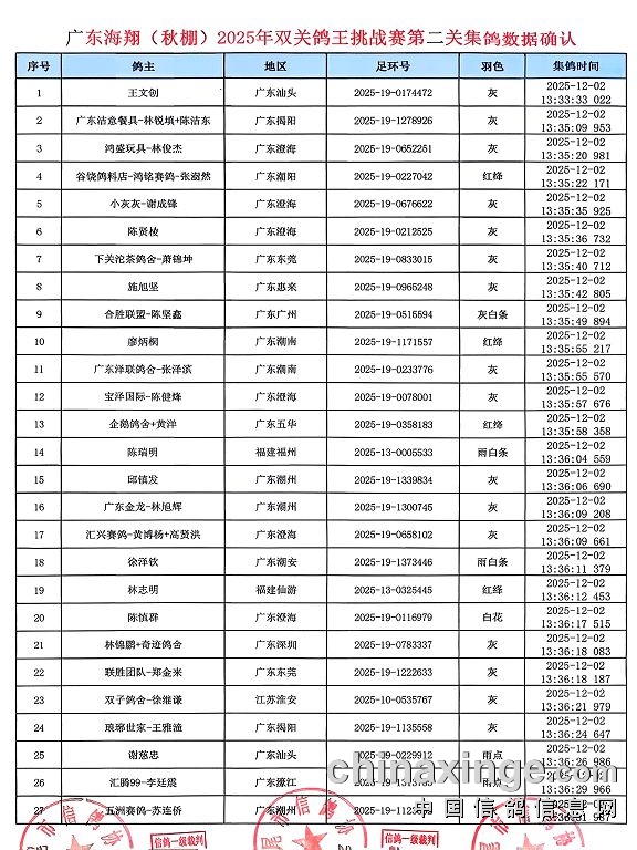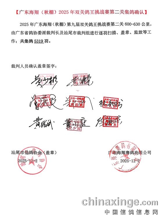 【广东海翔(秋棚)2025年双关鸽王挑战赛第二关集鸽确认】