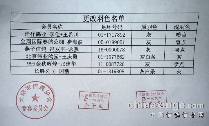 天津长江赛鸽公棚180-200公里热身赛更改羽色名单