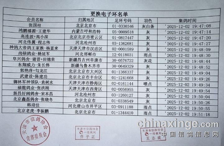 天津长江赛鸽公棚180-200公里热身赛更换电子环名单