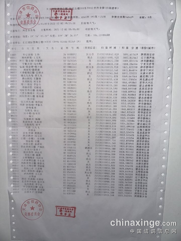天津长江赛鸽公棚186公里热身赛前50名实时打印成绩