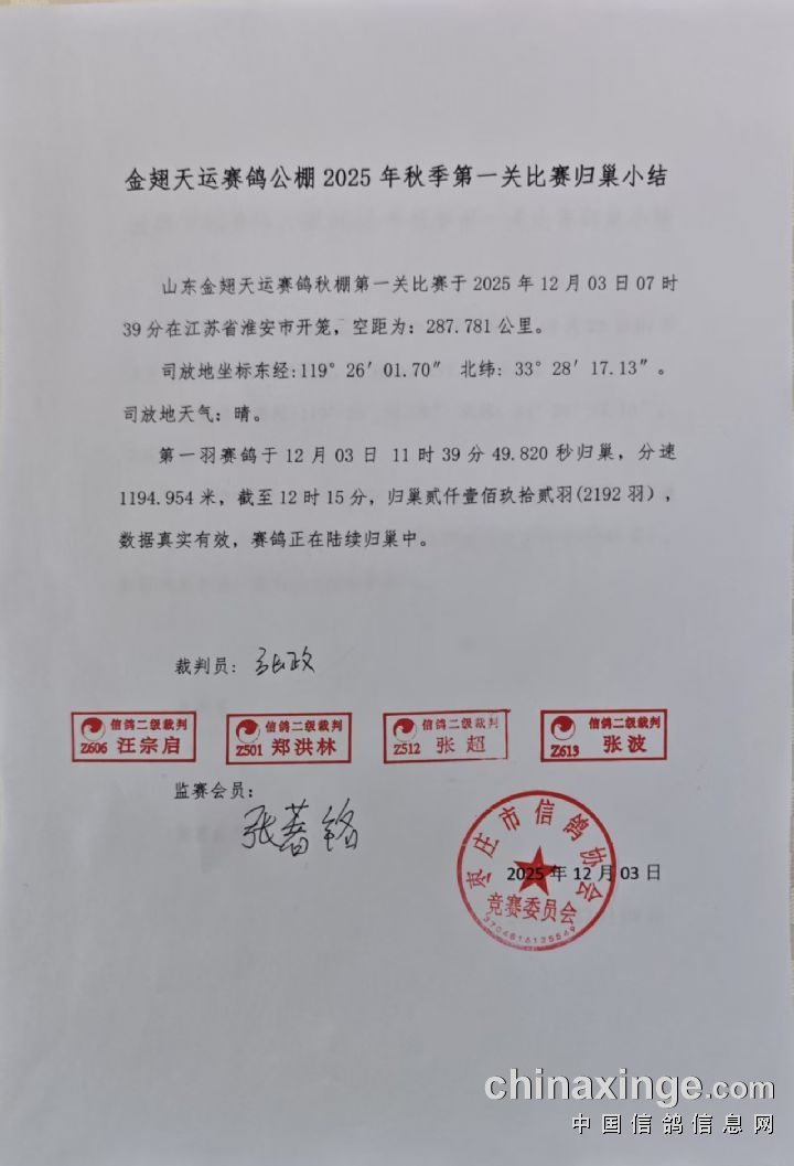 金翅天运(小秋棚)490-530公里第三关决赛开笼公告及扫描链接