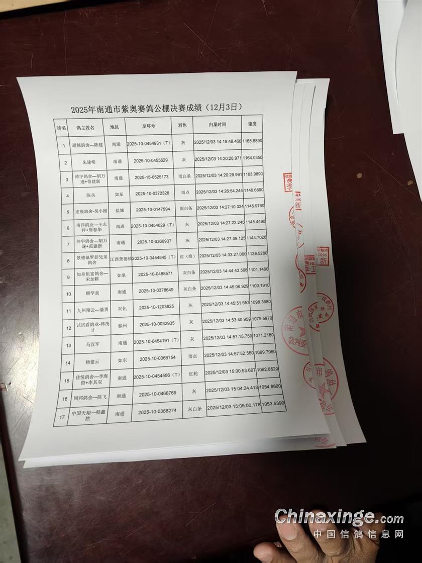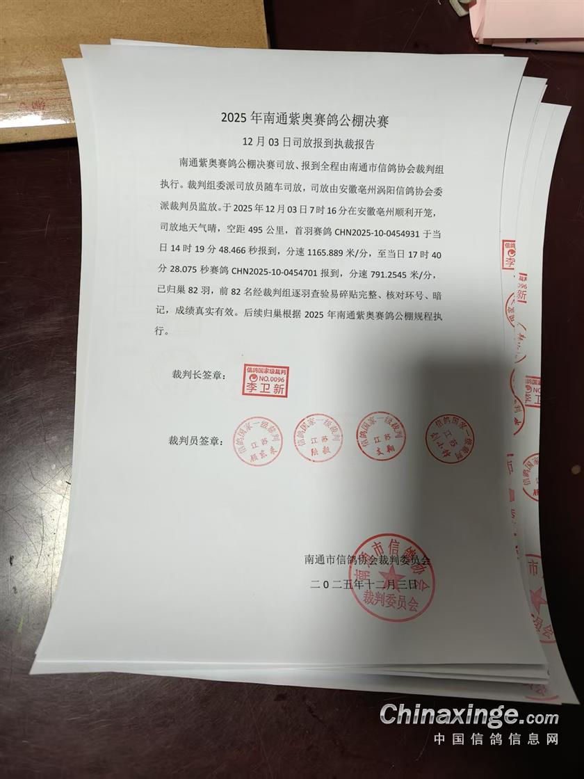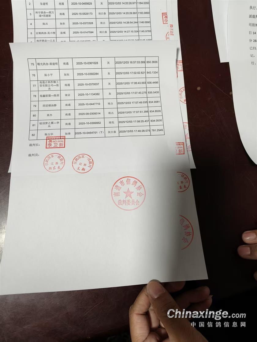 南通紫奥赛鸽公棚决赛当日归巢鸽裁判签章