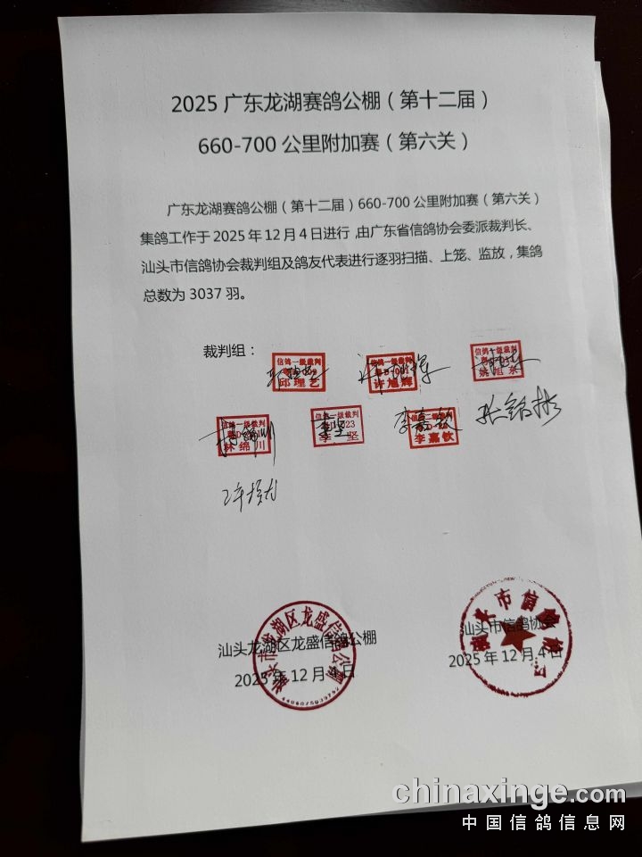 广东龙湖赛鸽公棚(第十二届)660-700公里附加赛(第六关)集鸽工作于2025年12月4日进行,由广东省信鸽协会委派裁判长、汕头市信鸽协会裁判组及鸽友代表进行逐羽扫描、上笼、监放,集鸽总数为3037羽。