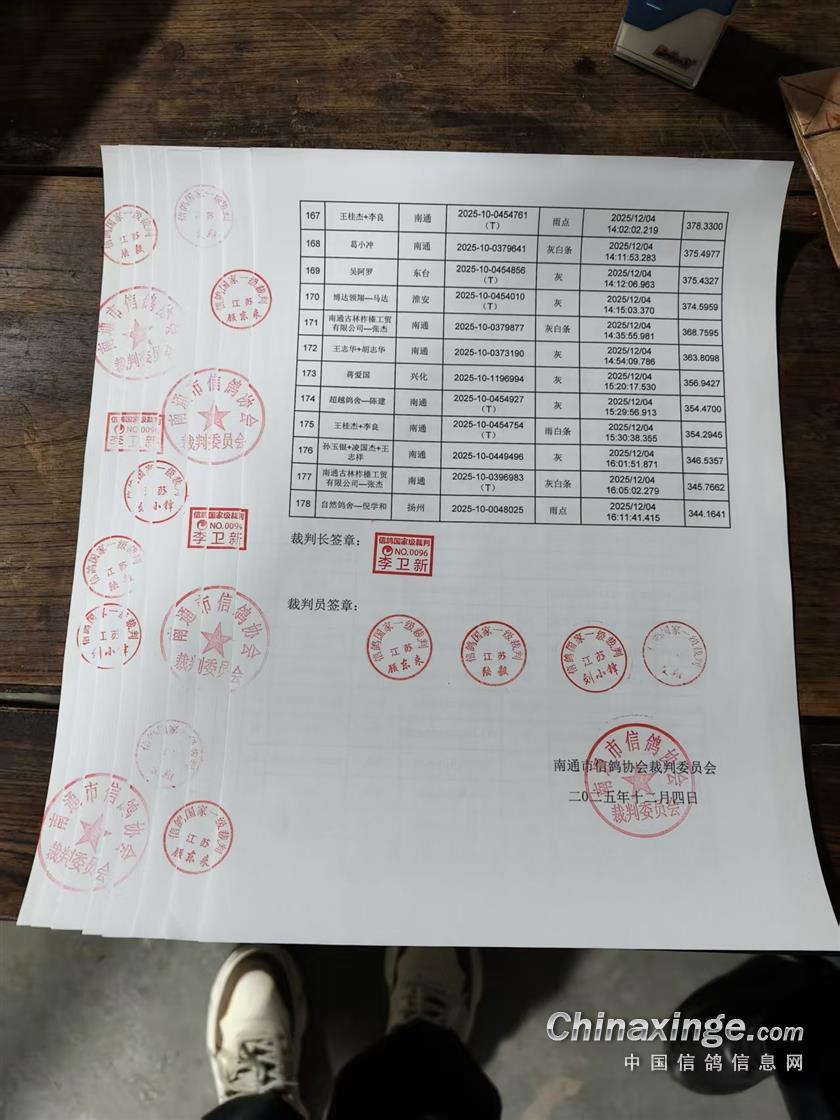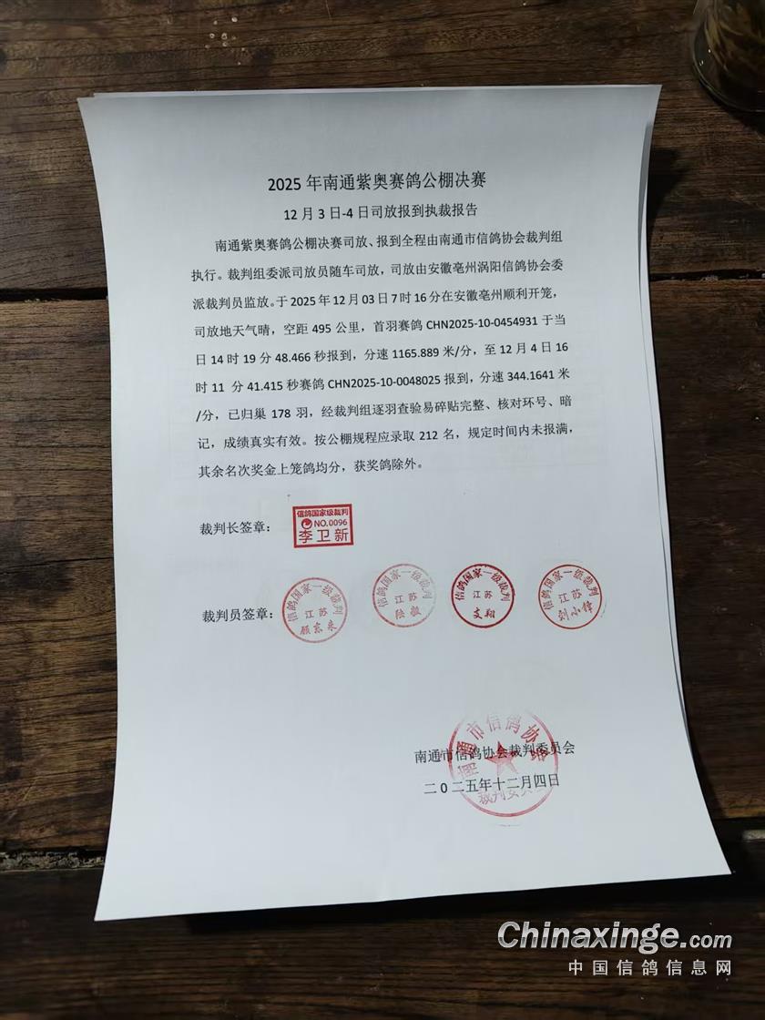南通紫奥赛鸽公棚决赛成绩裁判签章