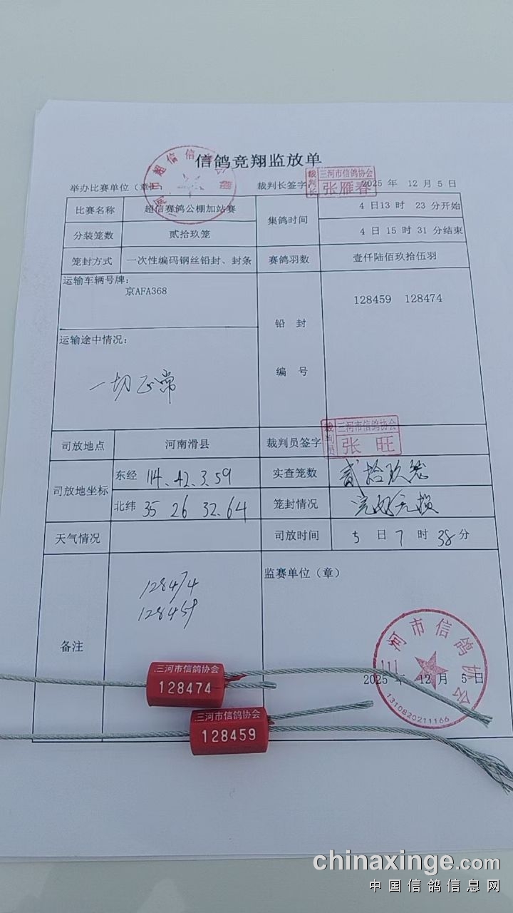 监放单位:三河市信鸽协会