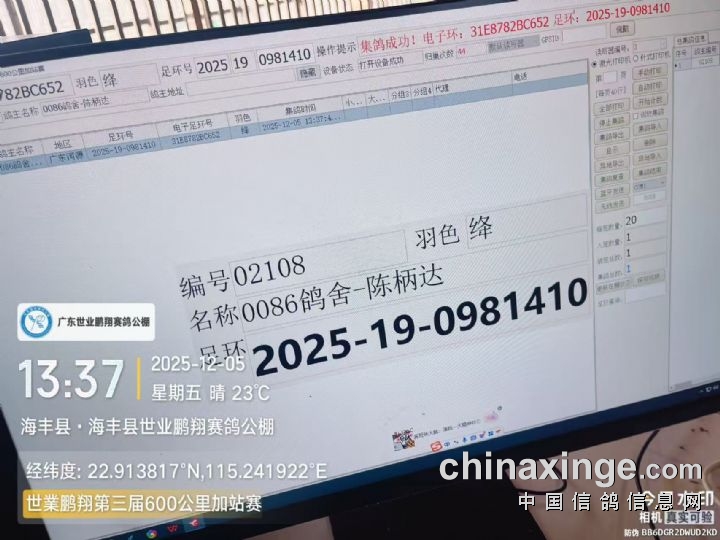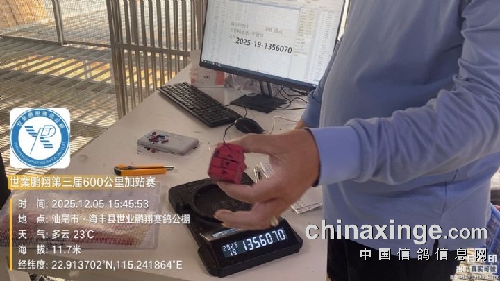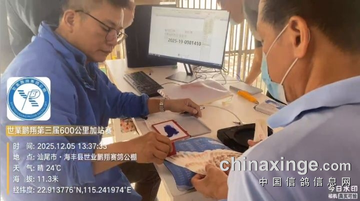 集鸽由广东省汕尾市鸽协委派裁判组监赛进行逐羽扫描、盖章、上笼等集鸽工作,共集鸽