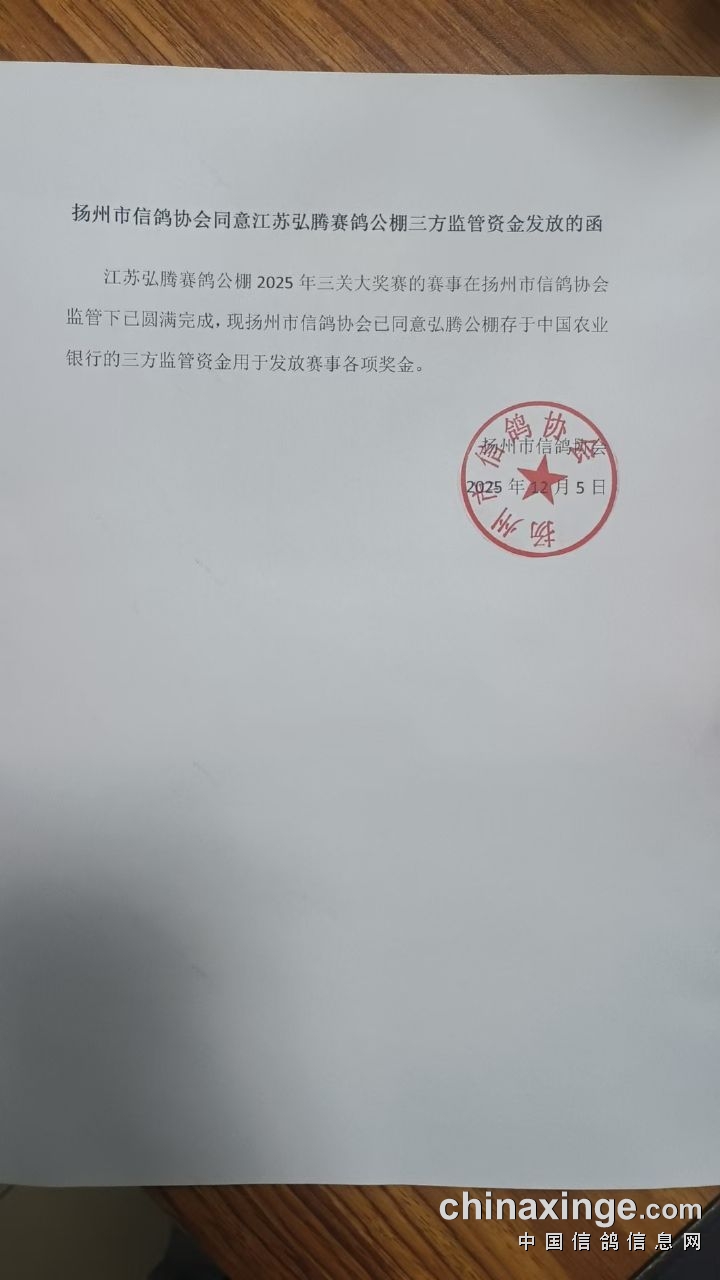 江苏弘腾赛鸽公棚决赛成绩已生效,决赛名次奖、三关鸽王、大小团体赛事奖金两天后发放。