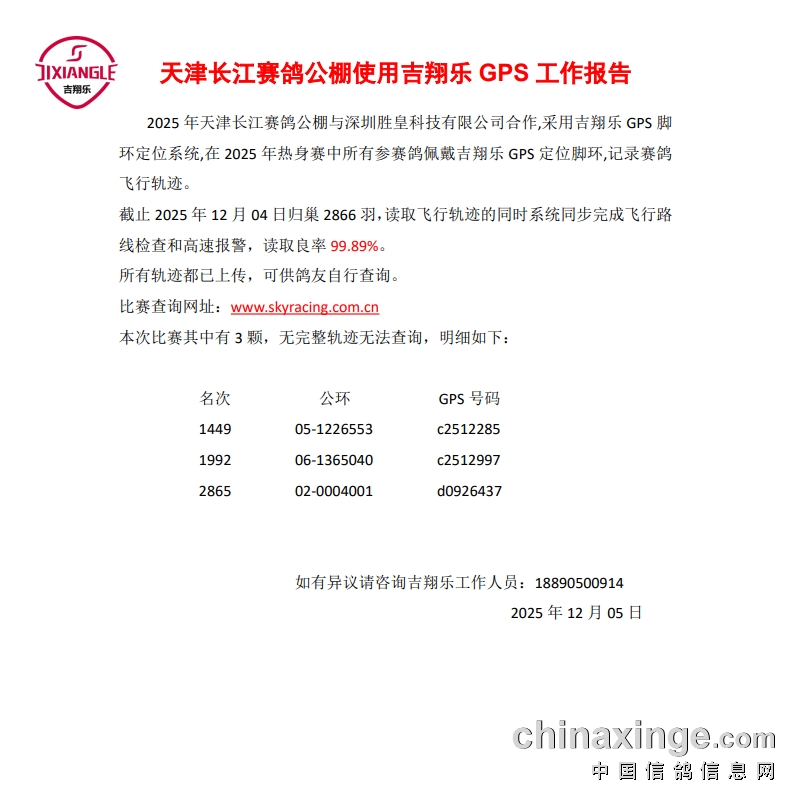 天津长江赛鸽公棚286公里第一关使用吉翔乐 GPS 工作报告