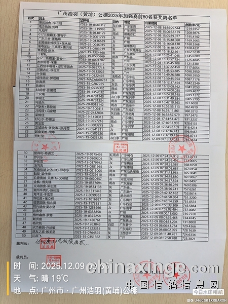 广州浩羽(黄埔)公棚迟归鸽名单