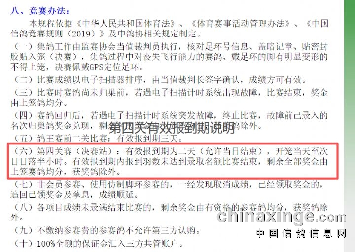 根据本届赛事规程规定,第四关决赛有效报到期截止至开笼次日日落半小时(即 12 月 9 日 17 时 29 分);若有效报到期内获奖名额未报满 1500 名,剩余全部奖金由上笼赛鸽均分,获奖鸽除外。