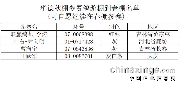 哈尔滨华德春棚·华德秋棚参赛鸽游棚到春棚名单
