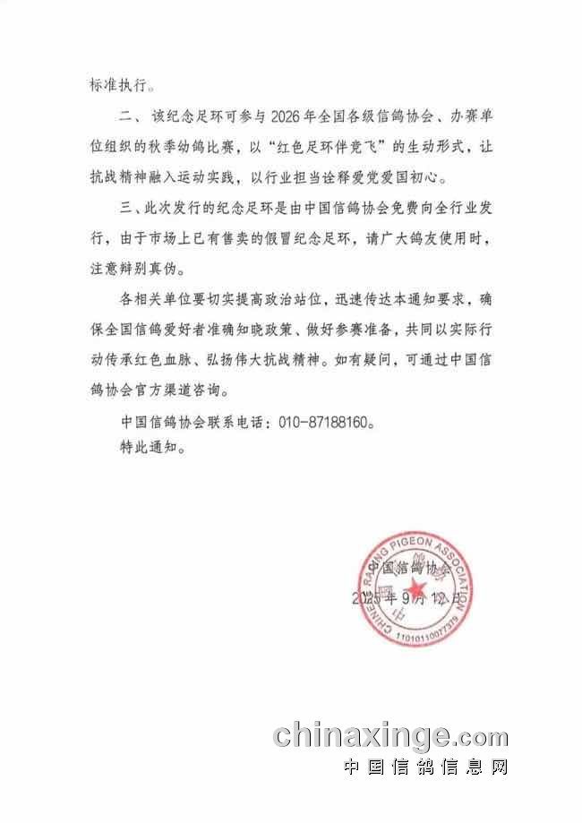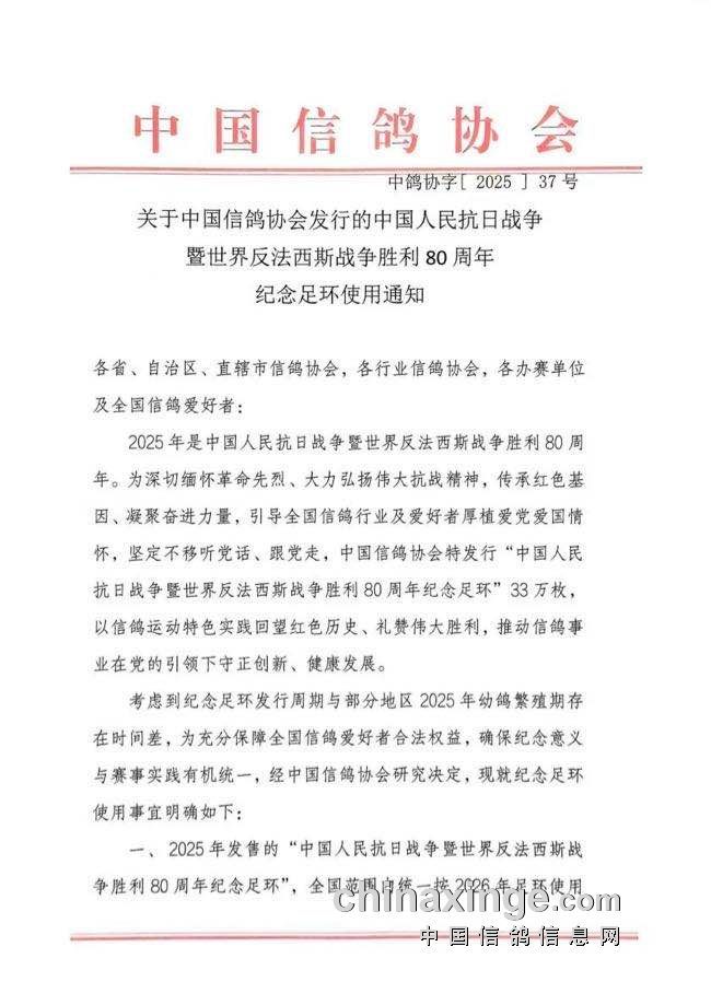 尊敬的鸽友及代理大家好,近期有鸽友询问我公棚中国人民抗日战争胜利80周年纪念环能否参赛一事,经向南充顺庆监赛协会咨询,80周年纪念环属于中国信鸽协会发放的正规足环,均可参加26年公棚一切赛事,请相互转告。后附文件: