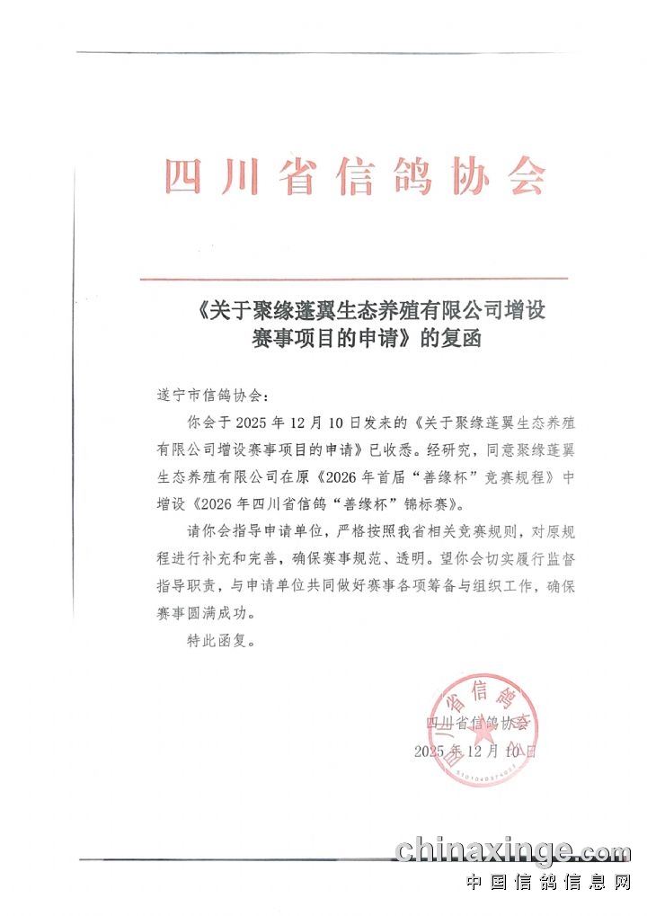 四川省信鸽协会复函