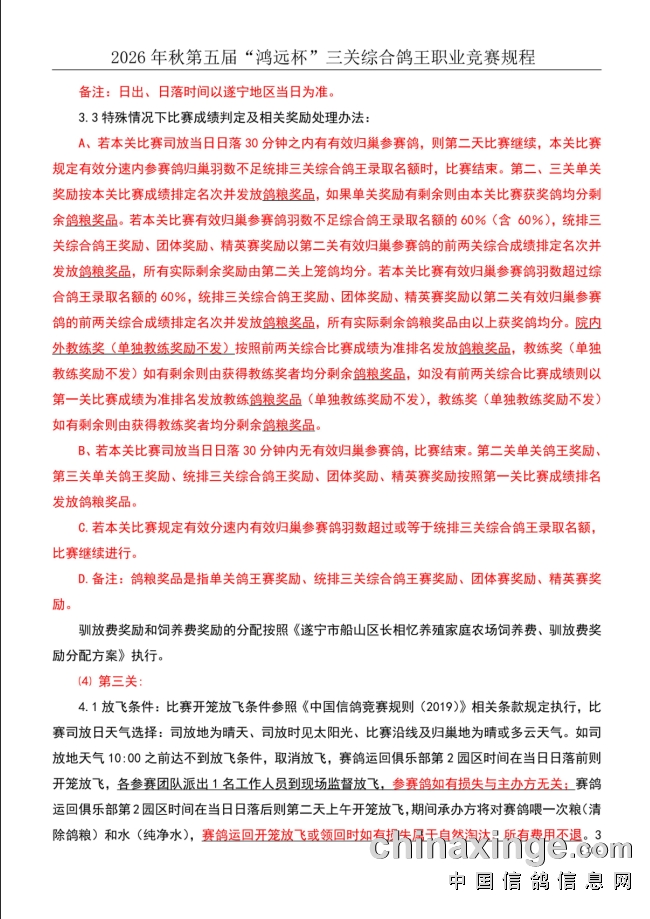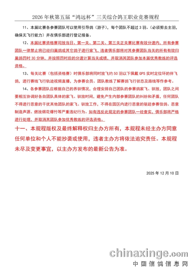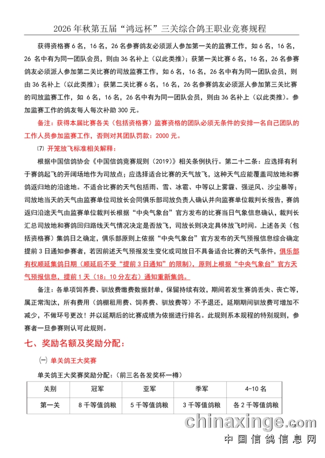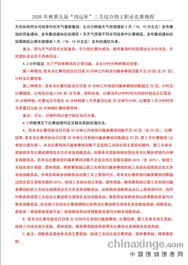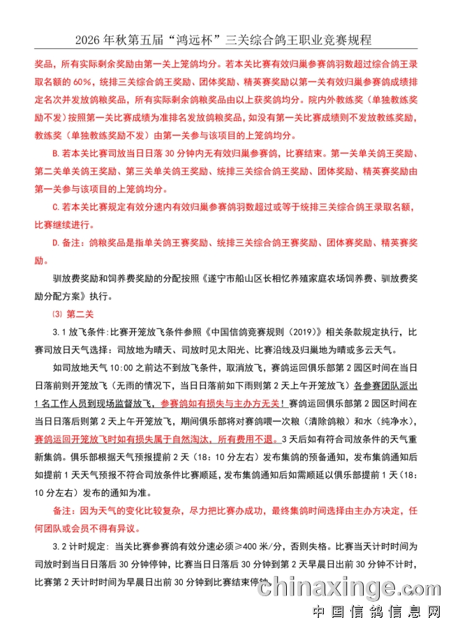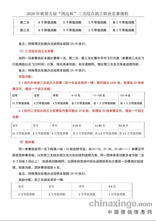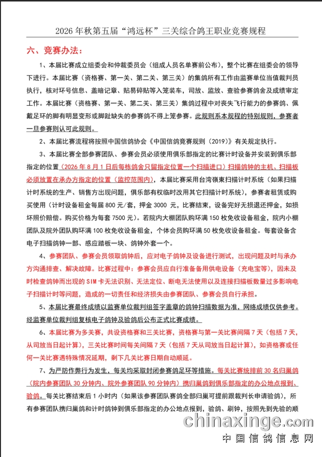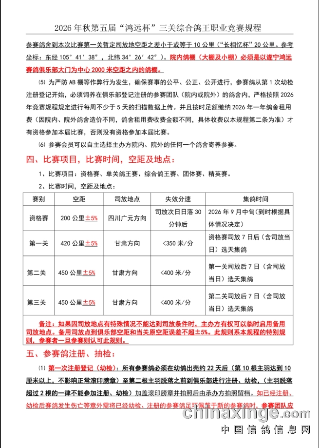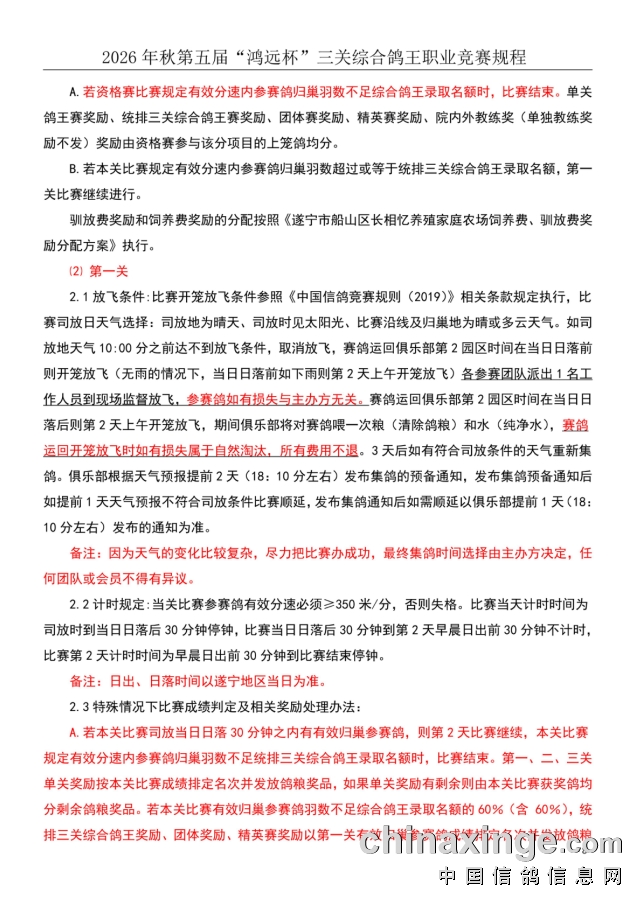 2026年秋第五届“鸿远杯”三关综合鸽王职业赛竞赛规程