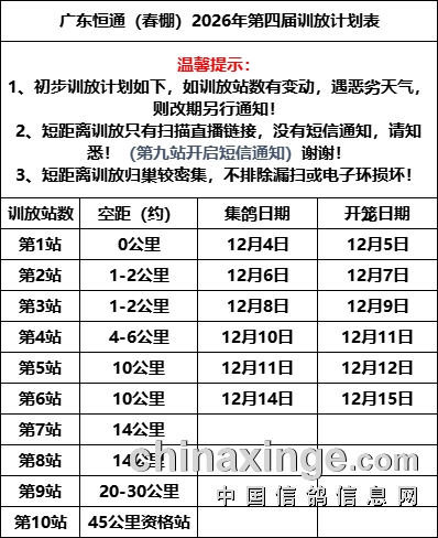 广东恒通(春棚)第六站11公里训放定于2025年12月14日晚集鸽,12月15日早上开笼!如遇恶劣天气,则改期另行通知!