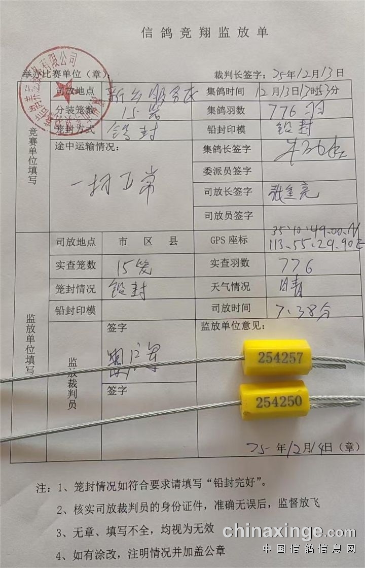 北京天翼赛鸽公棚加站赛在河南新乡服务区于2025年12月14日上午7时38分开笼。