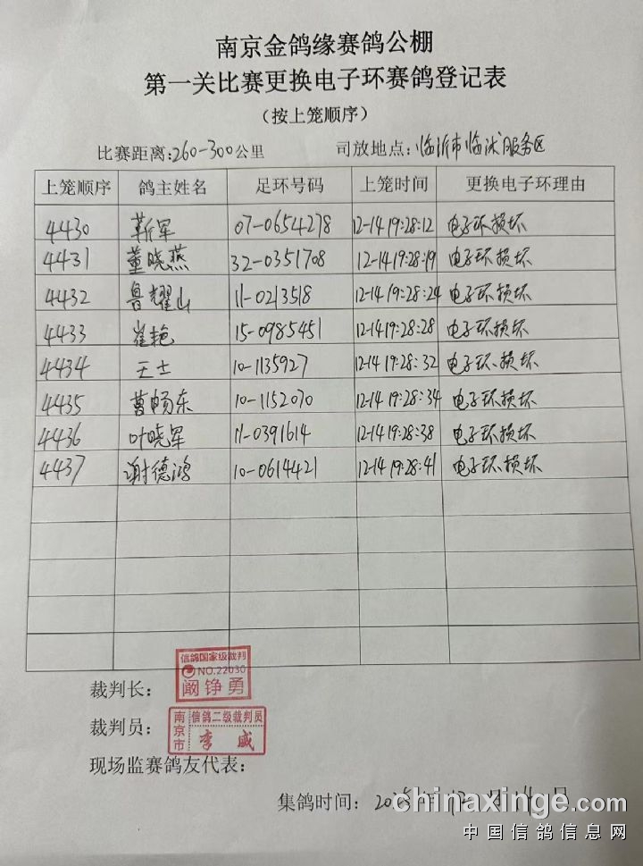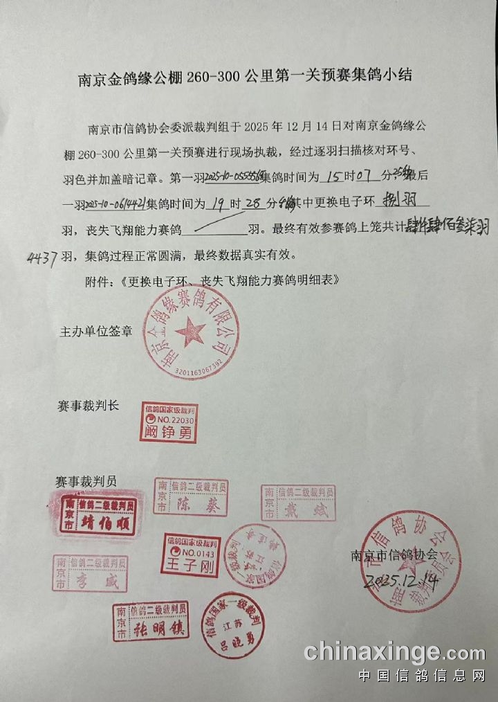 南京金鸽缘:第一关260-300公里预赛集鸽清单(按上笼顺序)