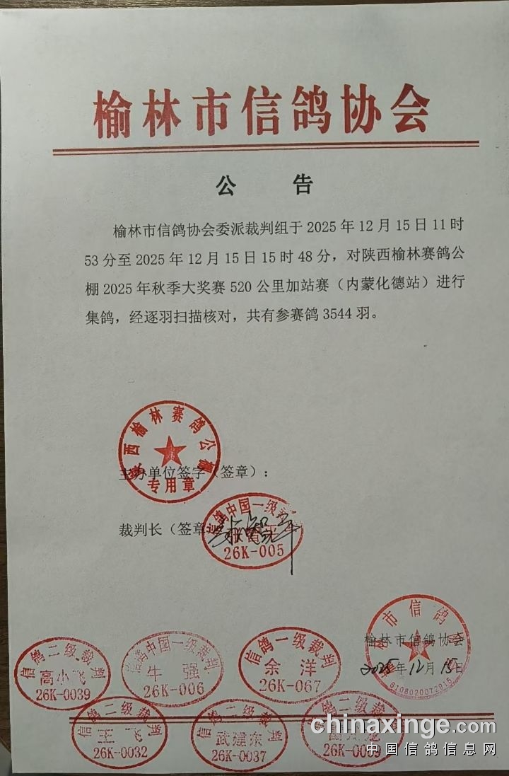 陕西榆林赛鸽公棚520公里加站赛奖金领取通知