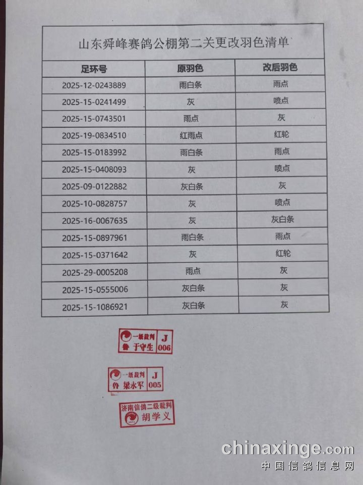 山东舜峰赛鸽公棚第二关更改羽色清单