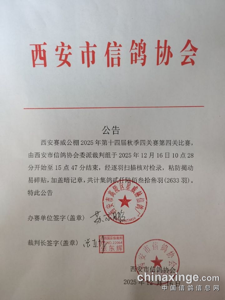 西安赛威公棚第四关开笼公告