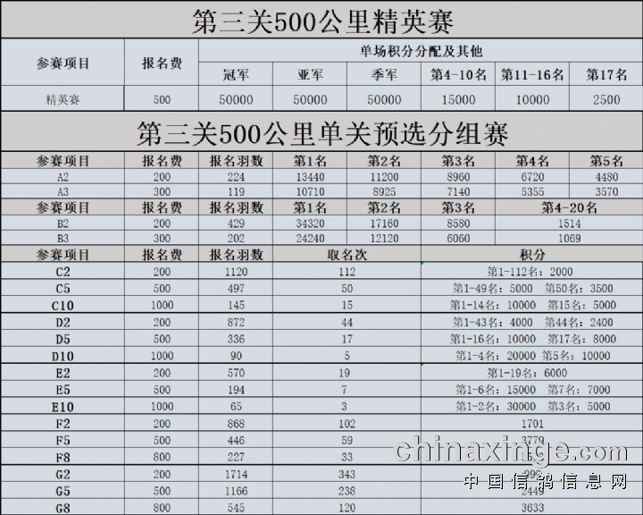 博达秋棚多关淘汰赛200、300、400、500公里排名