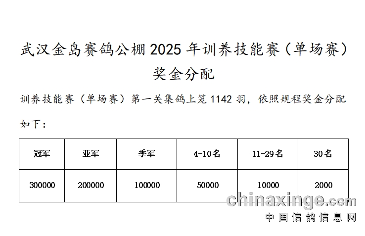 武汉金岛赛鸽公棚2025年训养技能赛(单场赛)奖金分配