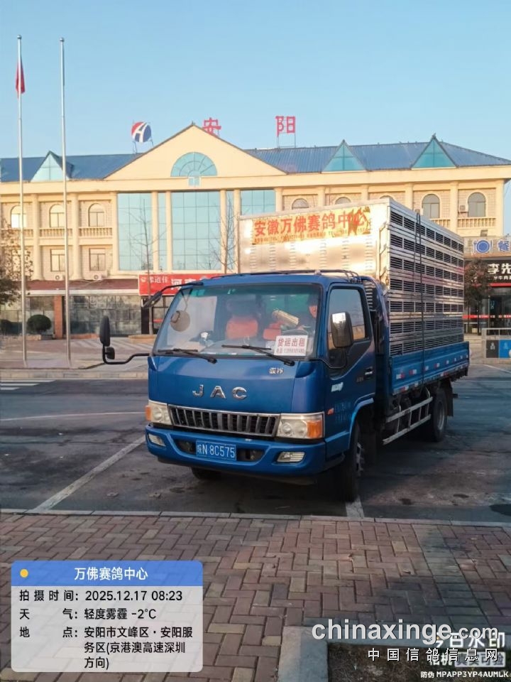 万佛赛鸽中心第四关550公里加站赛于2025年12月17日,7点46分在河南省安阳服务区开笼。放飞地坐标:东经114,24,48,北纬36,0,7.实际空距554公里。预祝各位会员取得好成绩。