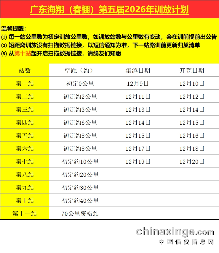广东海翔(春棚)第七站10公里训放定于2025年12月19日晚集鸽,20日早上开笼!如遇恶劣天气,则改期另行通知!