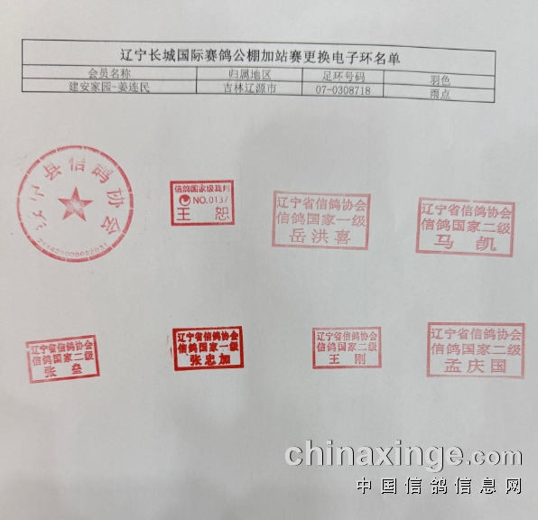 辽宁长城国际赛鸽公棚加站赛更换电子环名单