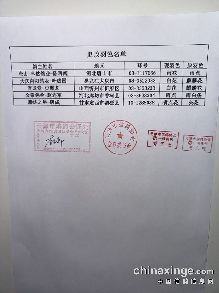 天津长江赛鸽公棚380-420公里预赛更改羽色名单