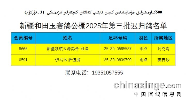 和田玉赛鸽公棚2025年第三批迟归鸽名单
