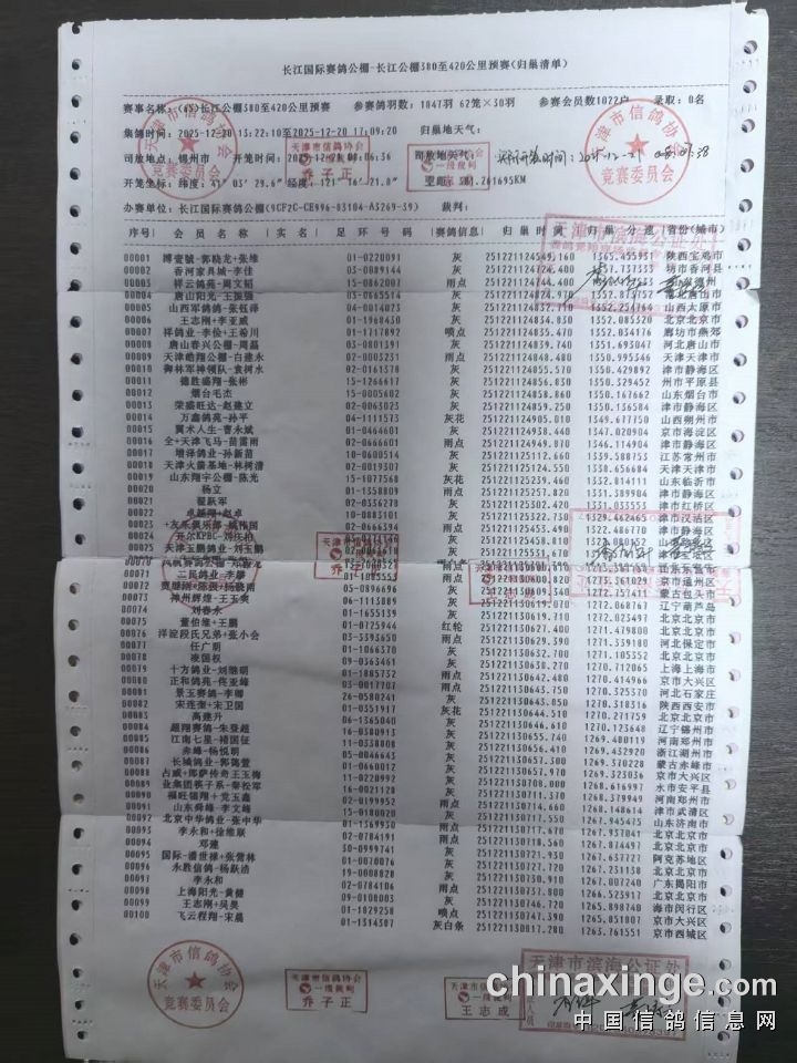 天津长江赛鸽公棚380-420公里预赛集鸽打印清单