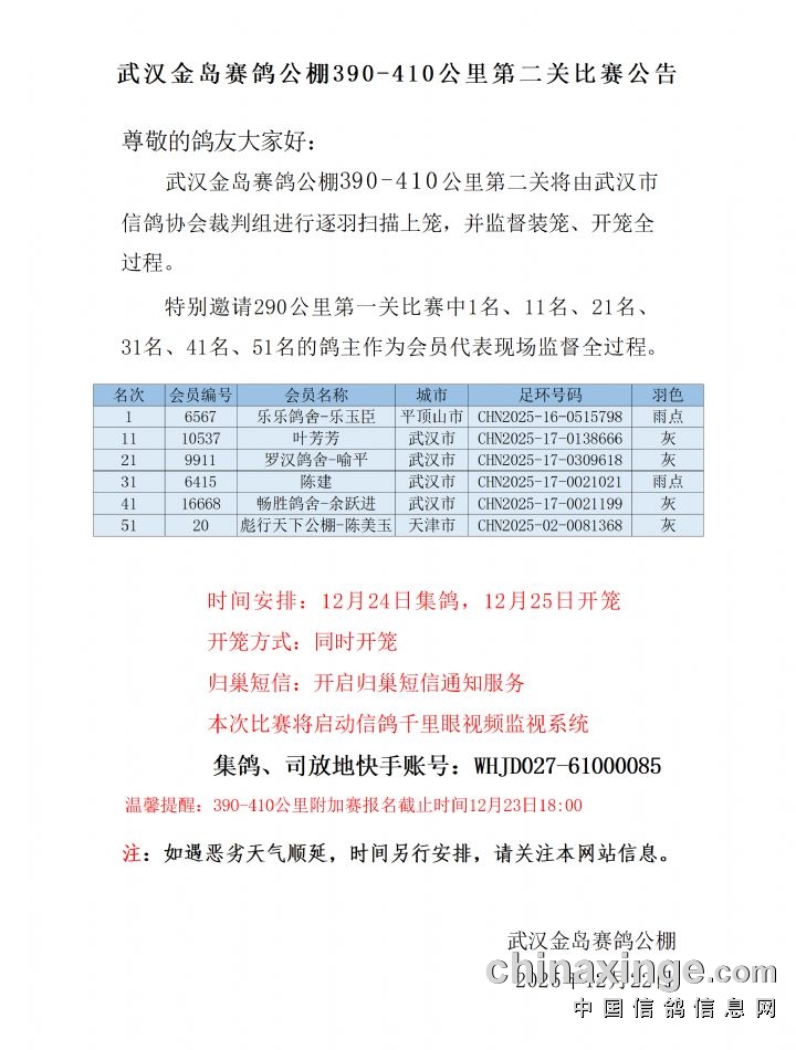 武汉金岛赛鸽公棚390-410公里第二关比赛公告