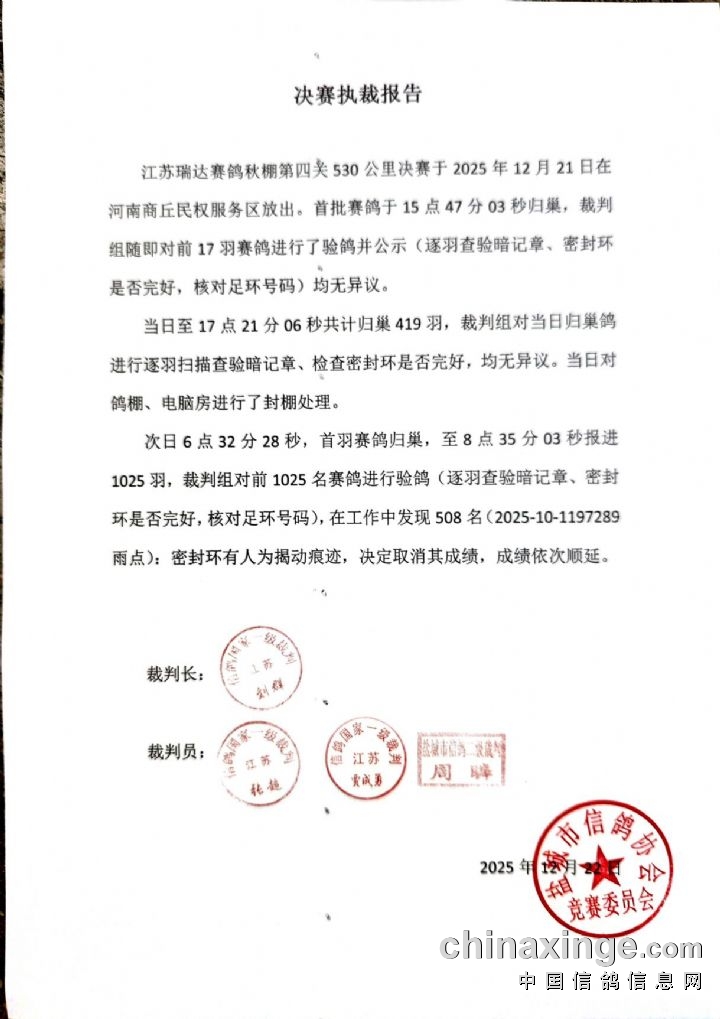 经盐城市信鸽协会验鸽,发现决赛508名(2025-10-1197289雨点)密封环有人为揭动痕迹,决定取消成绩,名次顺延。