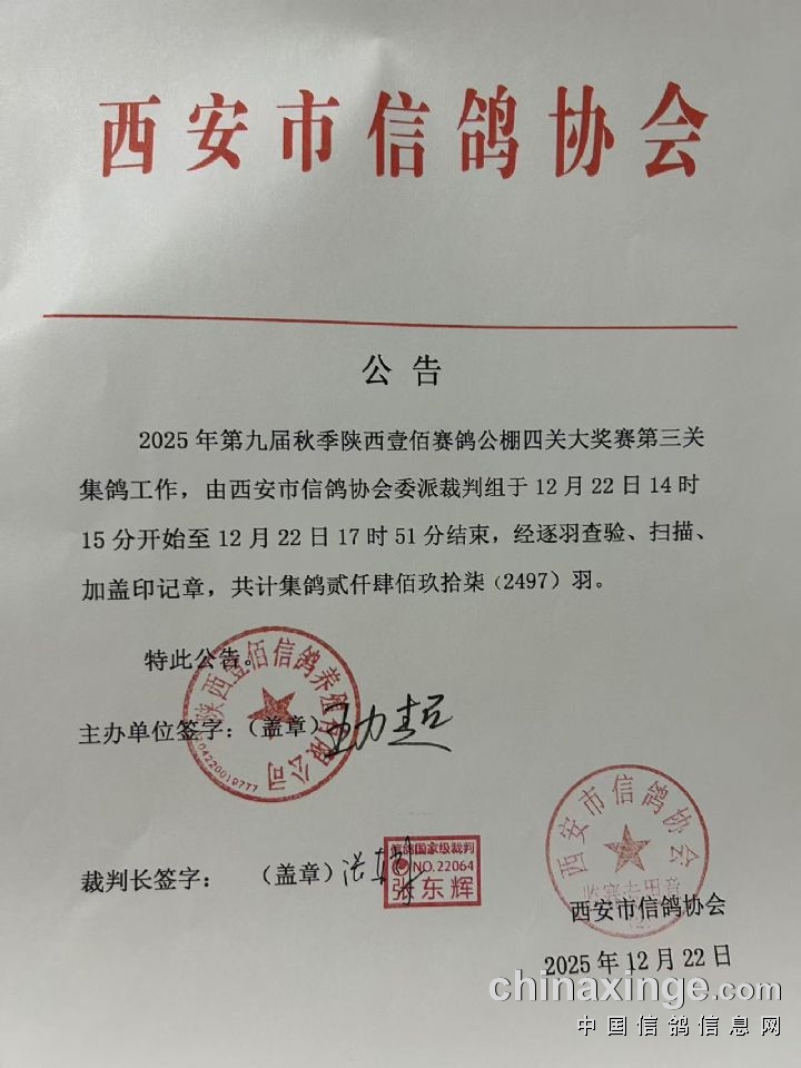 陕西壹佰赛鸽公棚第三关比赛成绩(前300名)公告