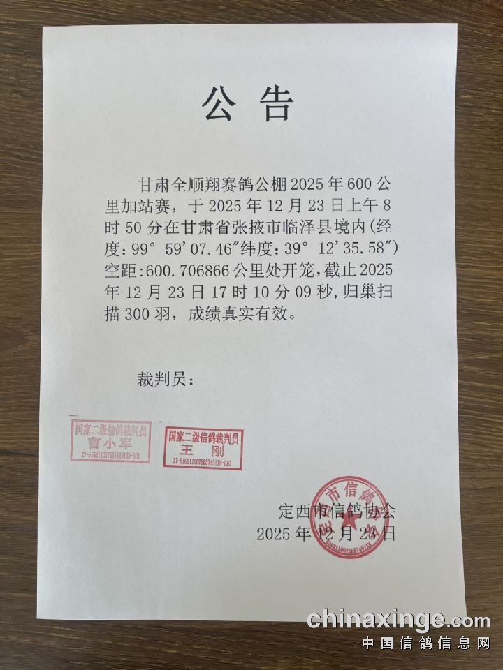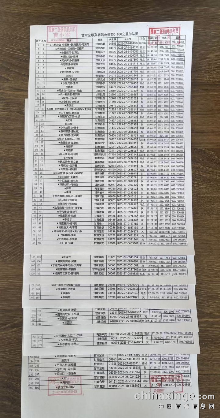 甘肃全顺翔:2025年600公里加站赛定西市信鸽协会公告