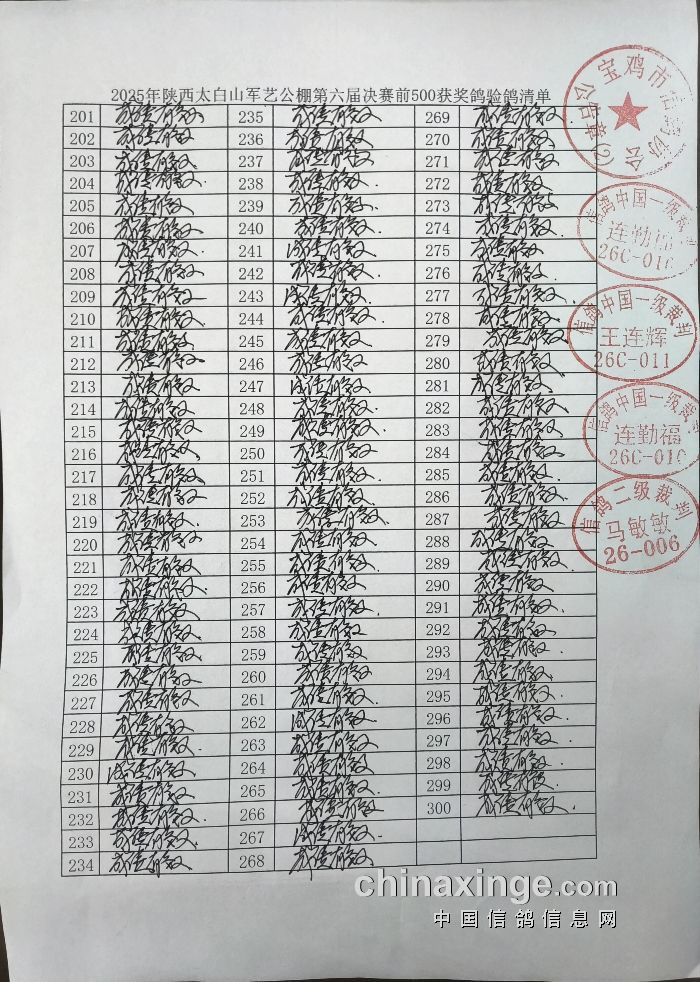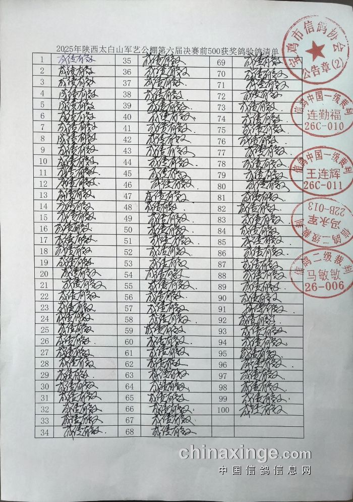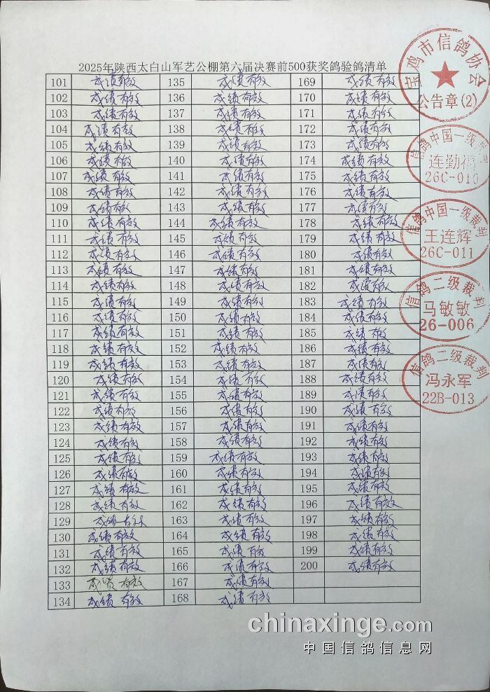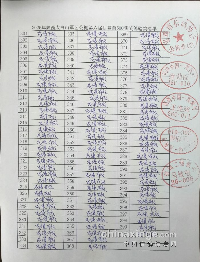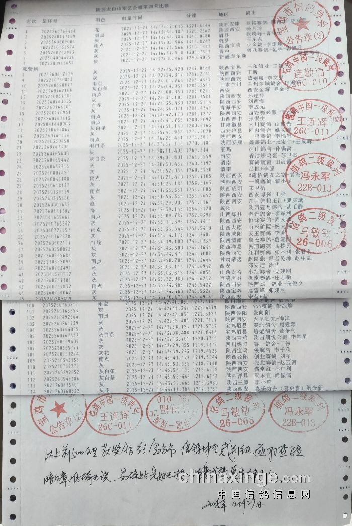 陕西太白山军艺公棚2025年四关鸽王获奖名单