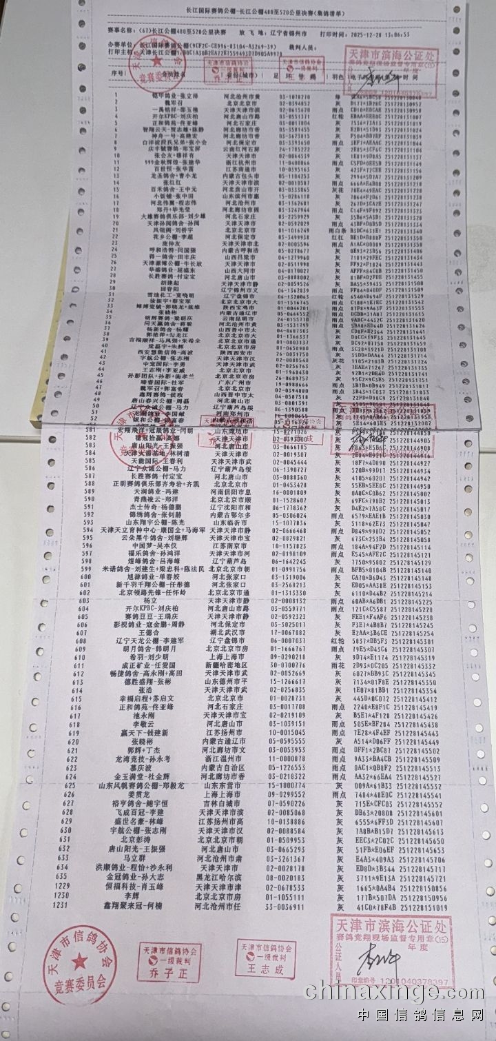 天津长江赛鸽公棚480-520公里决赛集鸽打印清单