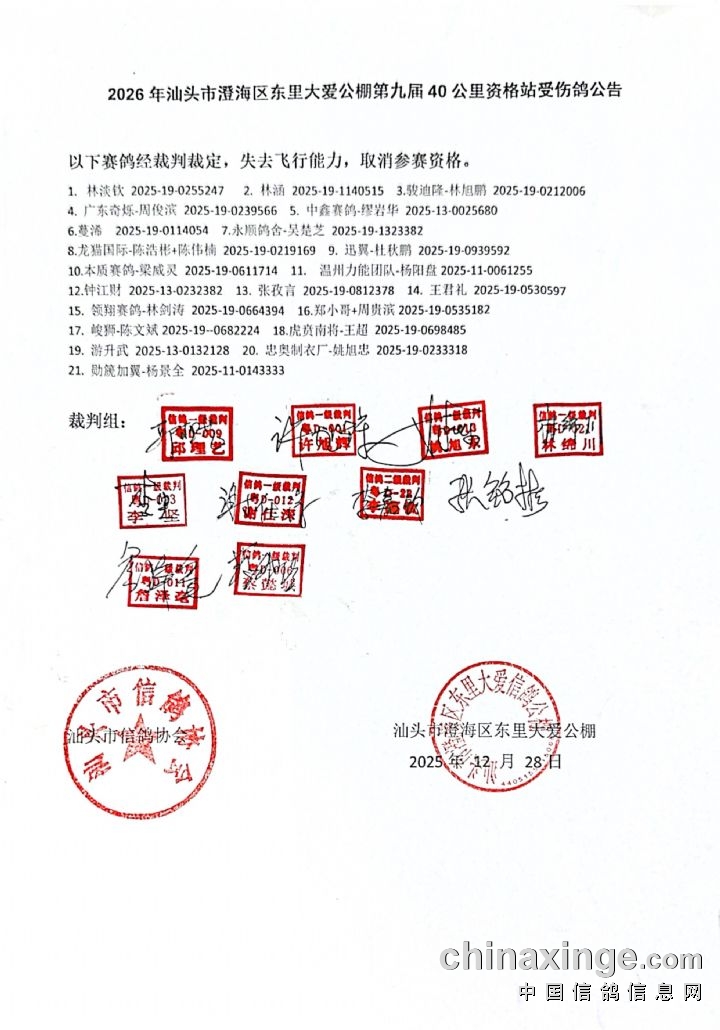 汕头市澄海区东里大爱信鸽公棚(第九届)40公里资格站受伤鸽公告