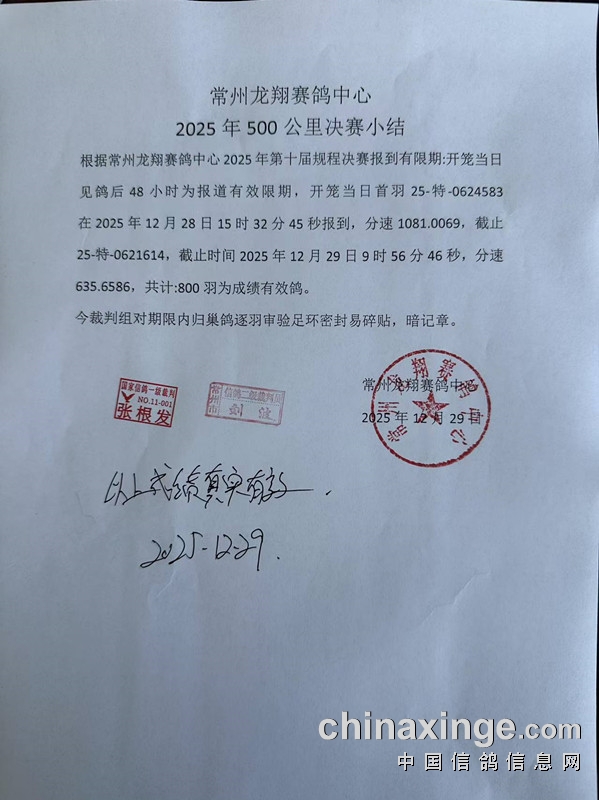 常州龙翔:2025年500公里(决赛)附加精英赛未上笼清单