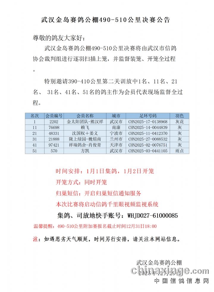 武汉金岛赛鸽公棚490-510公里决赛公告
