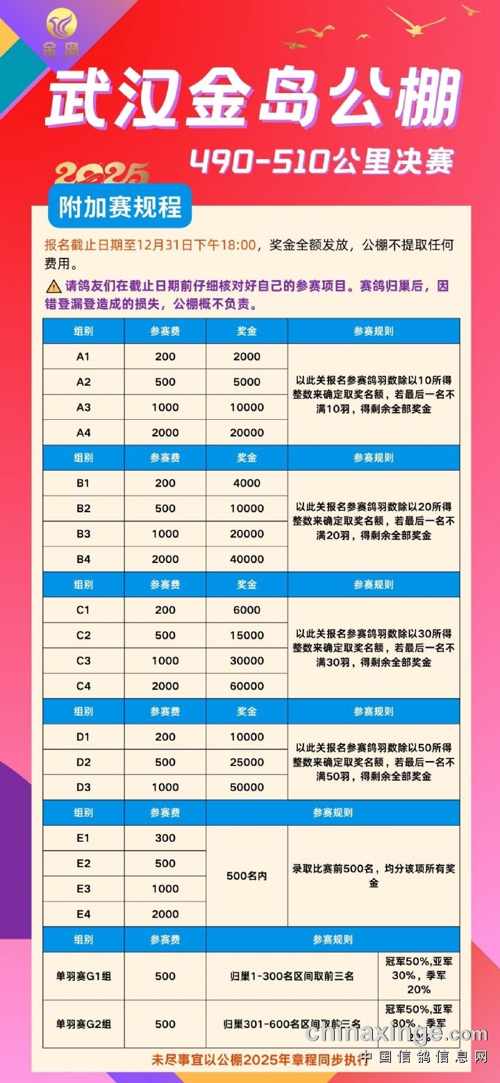 武汉金岛公棚2025年秋500公里比赛信鸽附加赛规则
