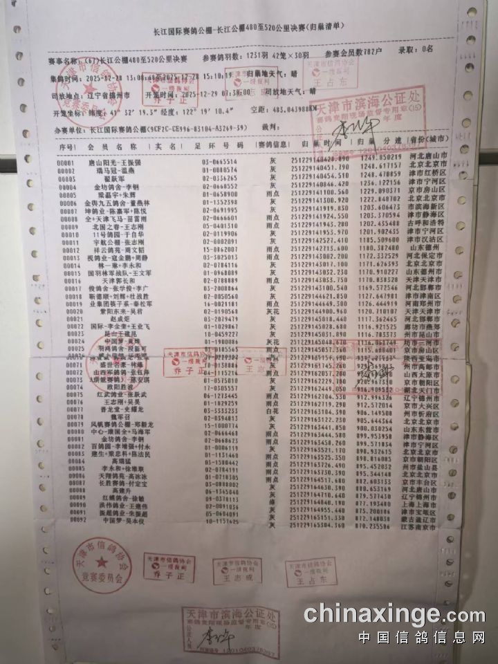 天津长江赛鸽公棚480-520公里决赛集鸽打印清单